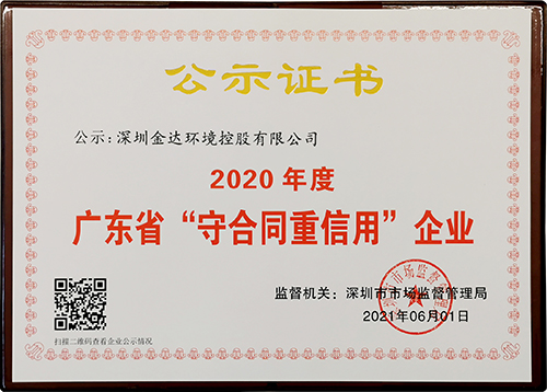 廣東省守合同重信用企業(yè)認證是社會信用體系建設的重要組成部分,由廣東省市場監(jiān)督管理局根據企業(yè)信用標準體系對企業(yè)開展多維度審核而評定。金達環(huán)境獲榮2020年度廣東省守合同重信用企業(yè)稱號,標志著監(jiān)管部門對金達環(huán)境在合同管理、履約能力、社會信譽等方面的高度認可。